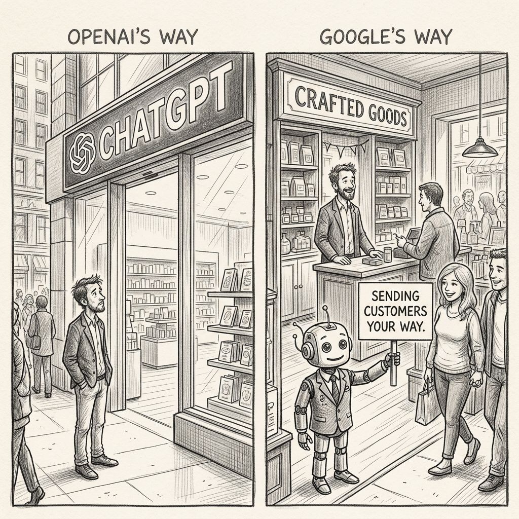 January 2026: Google and Shopify build a competing system called UCP. Backed by Walmart, Target, Etsy, Wayfair, Visa, Mastercard, and 20+ others. Different idea entirely. When someone asks any AI assistant what to buy, your product shows up. But the purchase happens on your own website, in your checkout, on your terms. You stay in control of the whole experience.