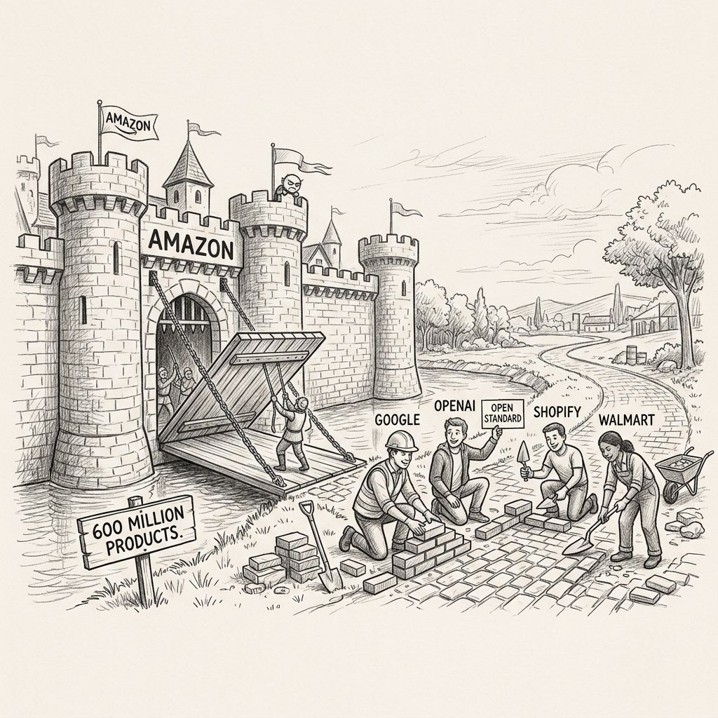 One thing nobody's talking about: Amazon looked at both systems and said no thanks. Blocked the whole thing. Built its own AI shopping assistant instead and walled off 600 million products from ChatGPT's results. Amazon is betting it doesn't need to play with anyone else. Every other retailer is betting the future of AI shopping is open.